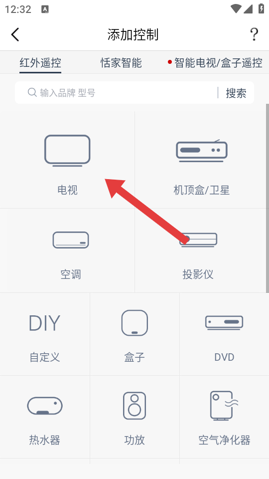 2、当我们在添加控制页面中,需要点击电视的选项,然后进入电视品牌选择界面。