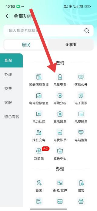 2、在全部功能的居民查询板块中,点击电量电费选项,进入电费查询页面。