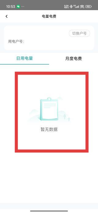 3、进入电量电费页面后,查看日用电量或月度电费板块,当前绑定户号显示暂无用电数据。