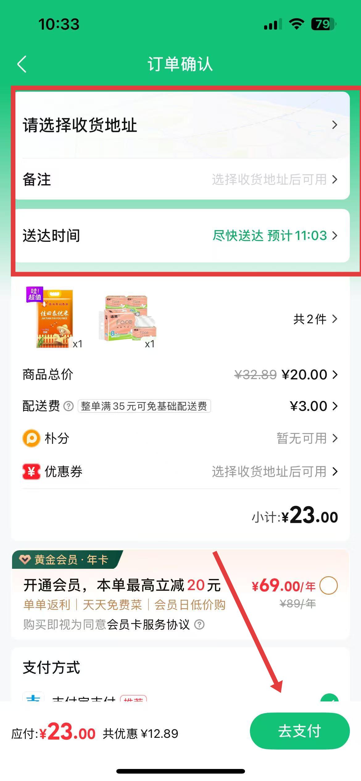 3、在订单确认页面,先选择收货地址,还可根据需求填写备注,选择送达时间,确认商品总价、配送费等信息,选择合适的支付等待商品配送即可。