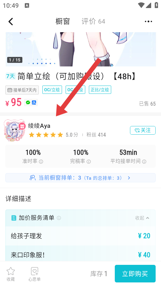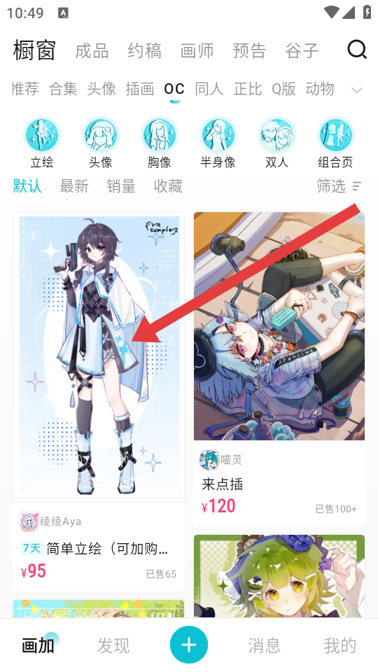 1、进入画加APP的橱窗页面,找到目标画师的作品卡片,点击进入这个作者作品的详情页。