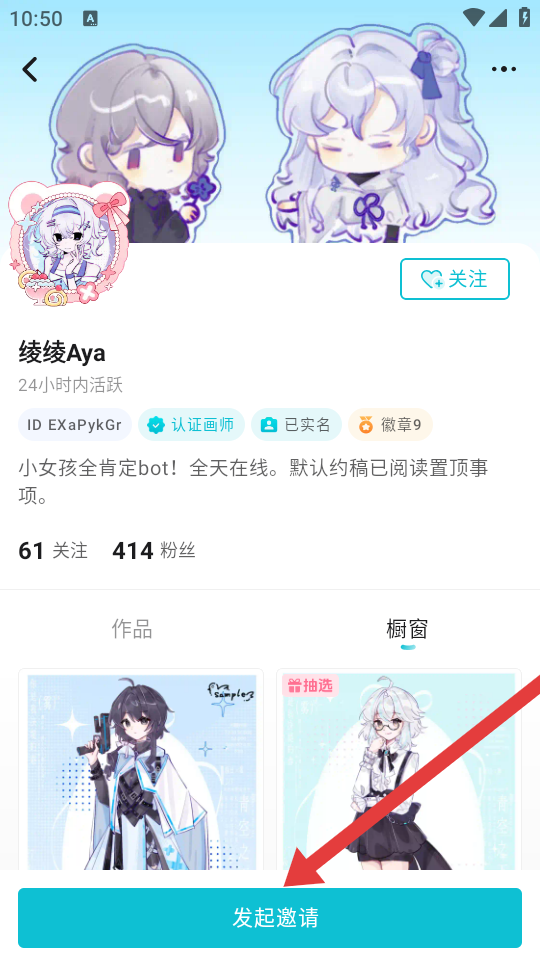3、在画师个人主页底部,点击发起邀请按钮,即可打开私信窗口,与画师沟通约稿或其他问题。