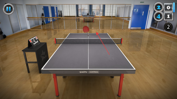 1、进入游戏,关注乒乓球运动轨迹按红箭头方向,预判球落点提前调整球拍位置准备接球同时留意右上角比分。