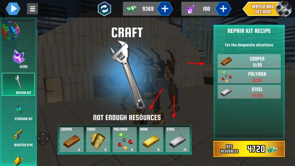1、进入Craft界面,参照配方如修理包需铜、聚合物等,收集购买资源,制作道具。