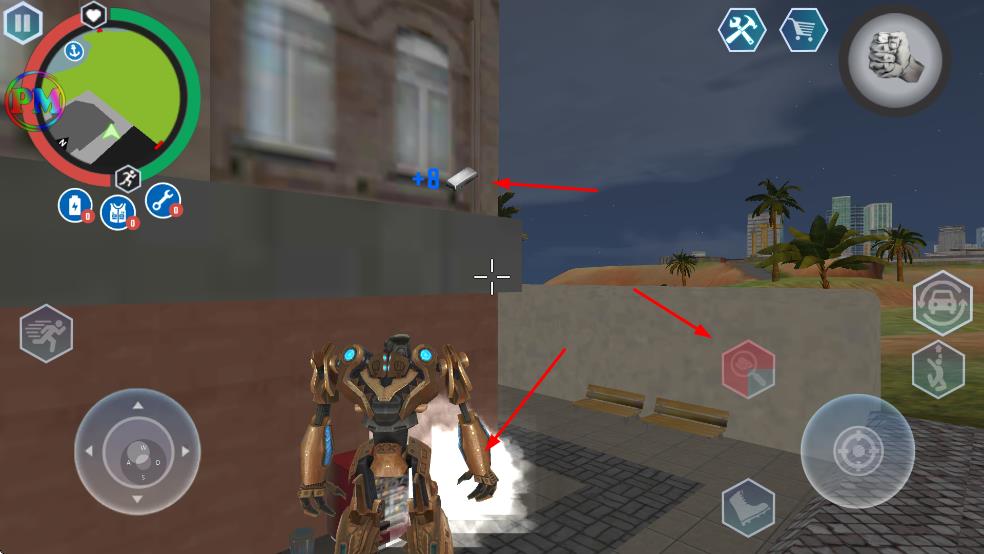 2、操控机器人在城市场景移动,拾取钢铁等资源,积累制作材料。
