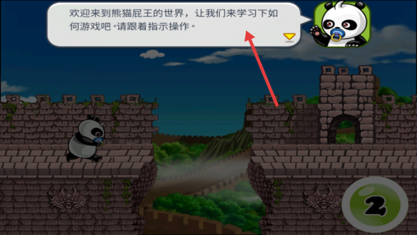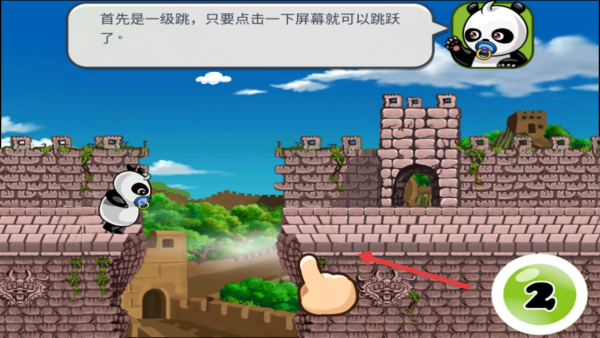 1、初入游戏,系统会自动弹出新手引导,在界面“小手”引导下点击屏幕,控制熊猫完成首次跳跃,感受跳跃操作的力度反馈,熟悉基础动作。