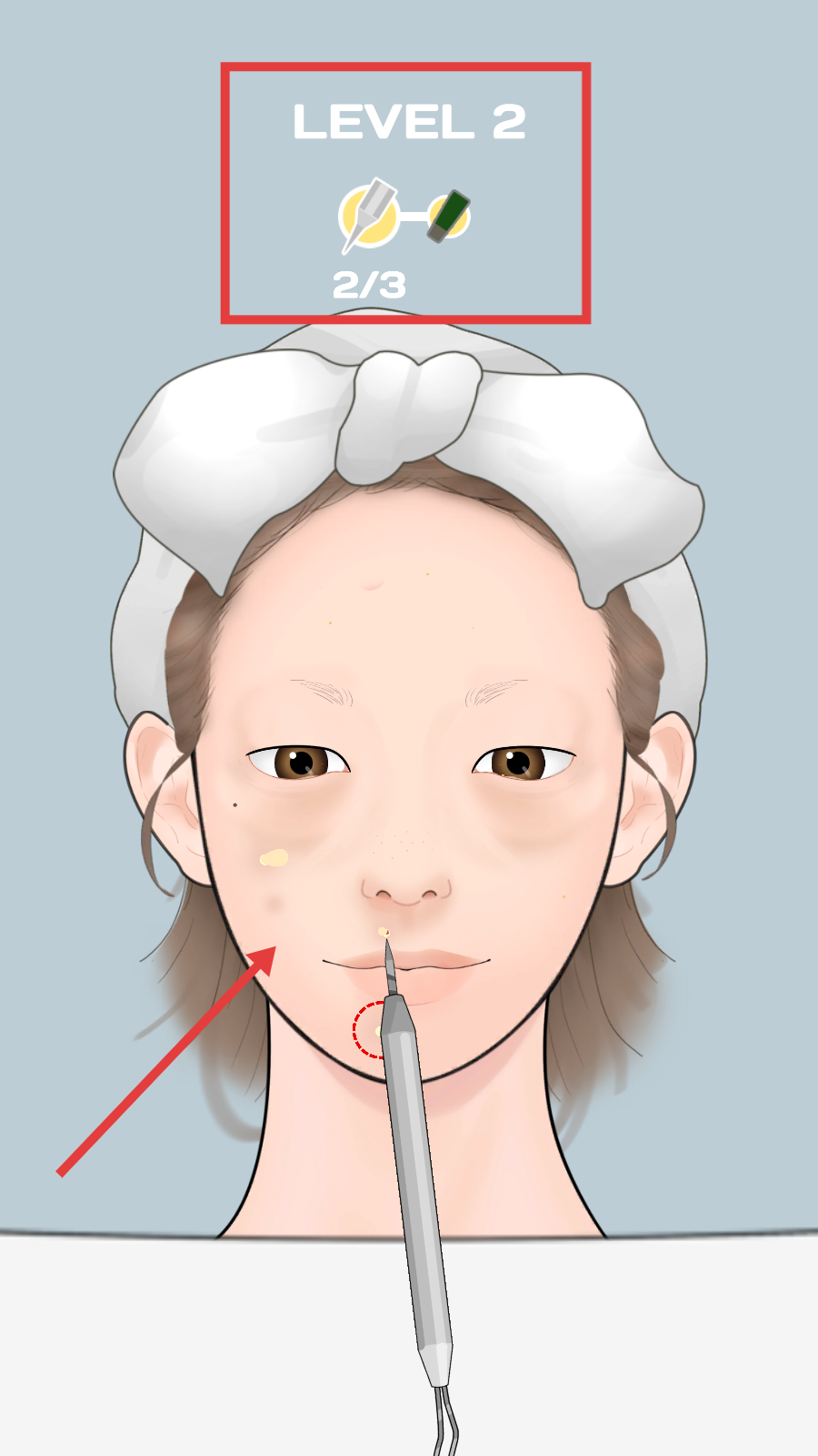 1、进入【LEVEL-2】,先用工具清理面部瑕疵,推进【2/3】进度,完成护肤步骤前半段。