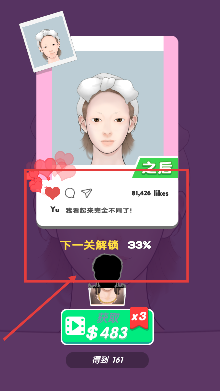3、完成护肤关卡后,查看【81,426-likes】数据,获知【下一关解锁-33%】进度,领取对应奖励推进游戏。