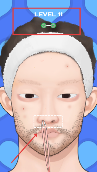 1、进入【LEVEL-11】,用镊子清理鼻下胡须,完成面部护理步骤,推进关卡进度。