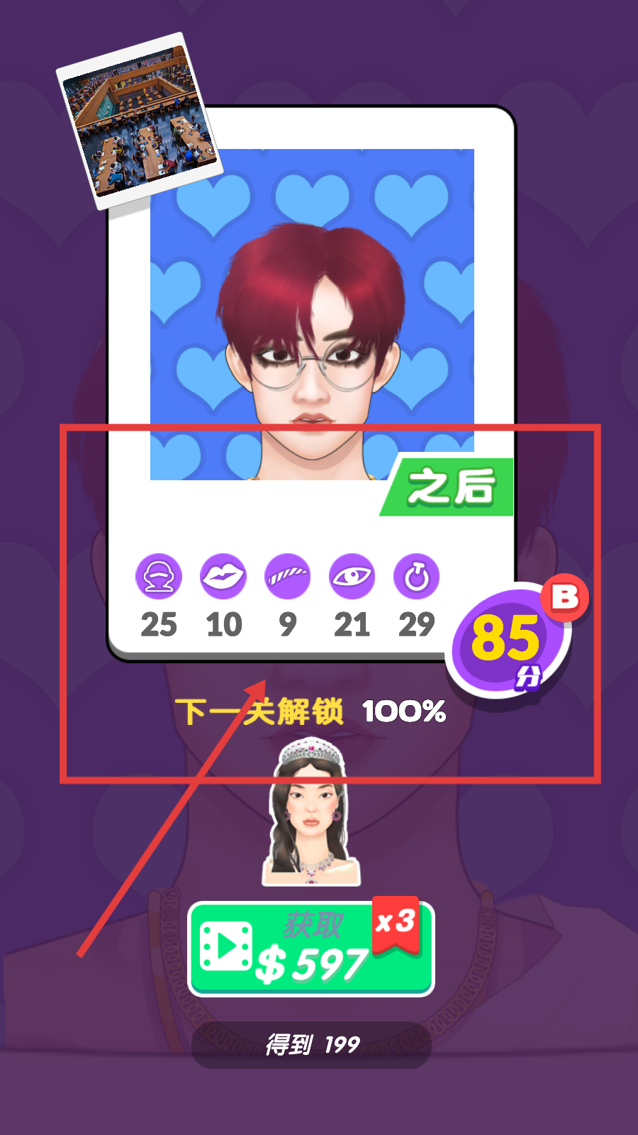 3、美妆关结束,查【85分-B级】评级,知【下一关解锁100%】,领奖励启新挑战。