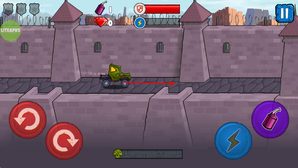 1、操控绿色战车从城堡出发,借助右侧炸弹、闪电按钮,规划行进路线,开启冒险。