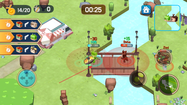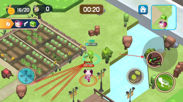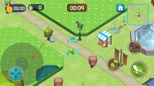 1、进入游戏通过左下方虚拟摇杆移动角色留意左上角金币数量和倒计时按红箭头方向探索场景。