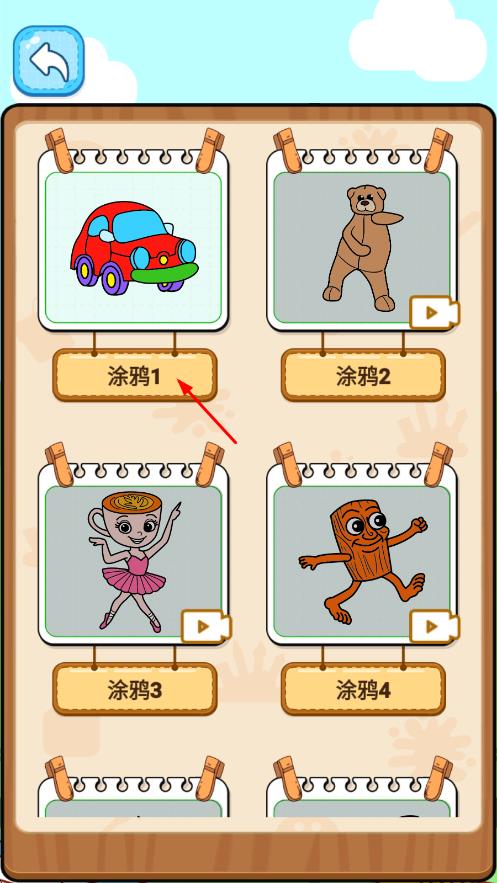2、在涂鸦选择页面,选定【涂鸦1-红色汽车】图案,点击进入该作品的填色创作环节。