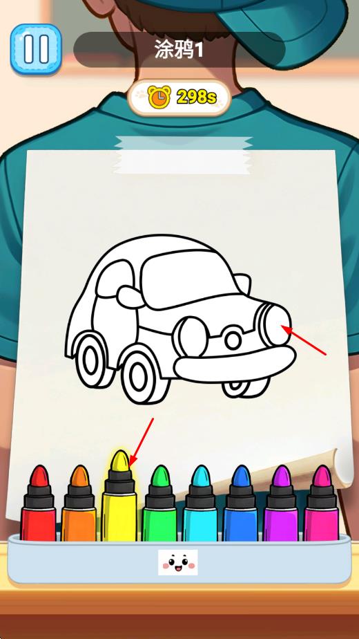3、于创作界面选取【黄色画笔】,为【涂鸦1-汽车】轮廓填色,利用限时【298s】完成绘画。