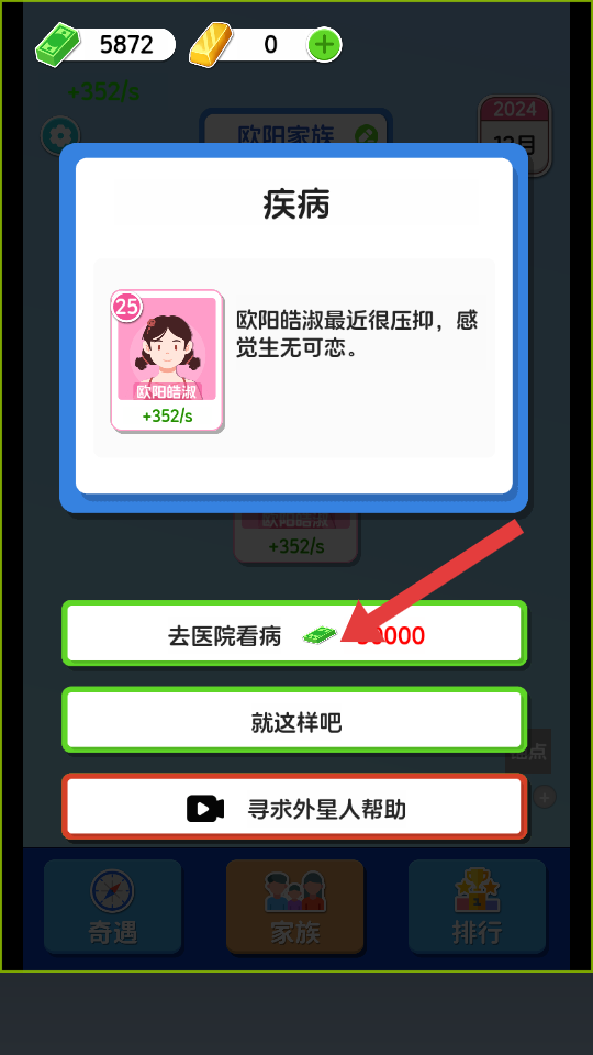 1、欧阳皓淑抑郁时解锁健康恢复选去医院看病,消耗5万现金修复状态;想解锁剧情看广告触发。