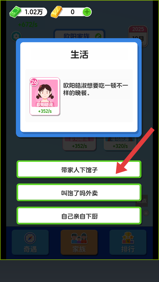 3、欧阳皓淑晚餐选择,解锁家族互动选带家人下馆子,想解锁快捷体验,点叫饱了吗外卖快速推进。