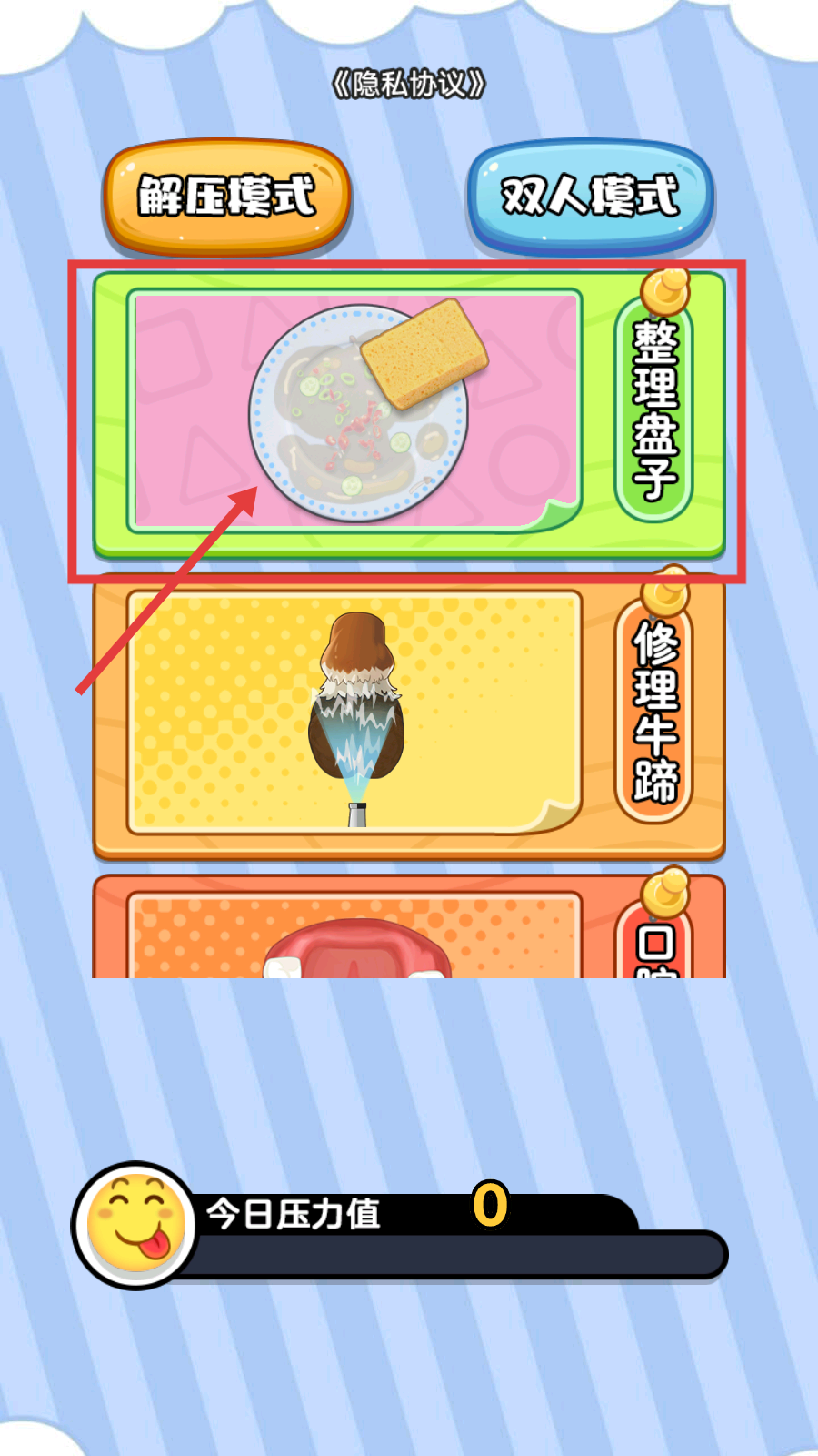 1、进入【解压模式】,选择【整理盘子】任务,开启餐具清洁的解压玩法,熟悉操作逻辑。