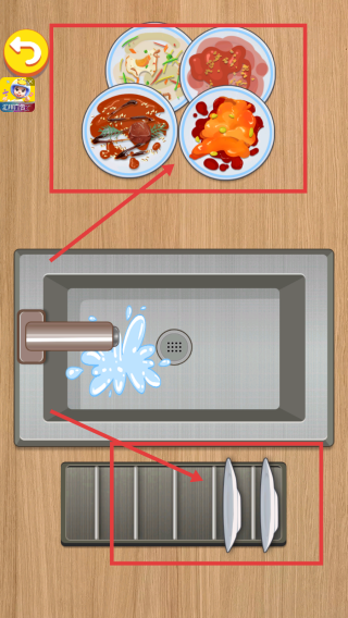 2、将脏盘子移至水槽冲洗,洗净后放置下方【沥干区】,完成餐具整理的步骤流程。