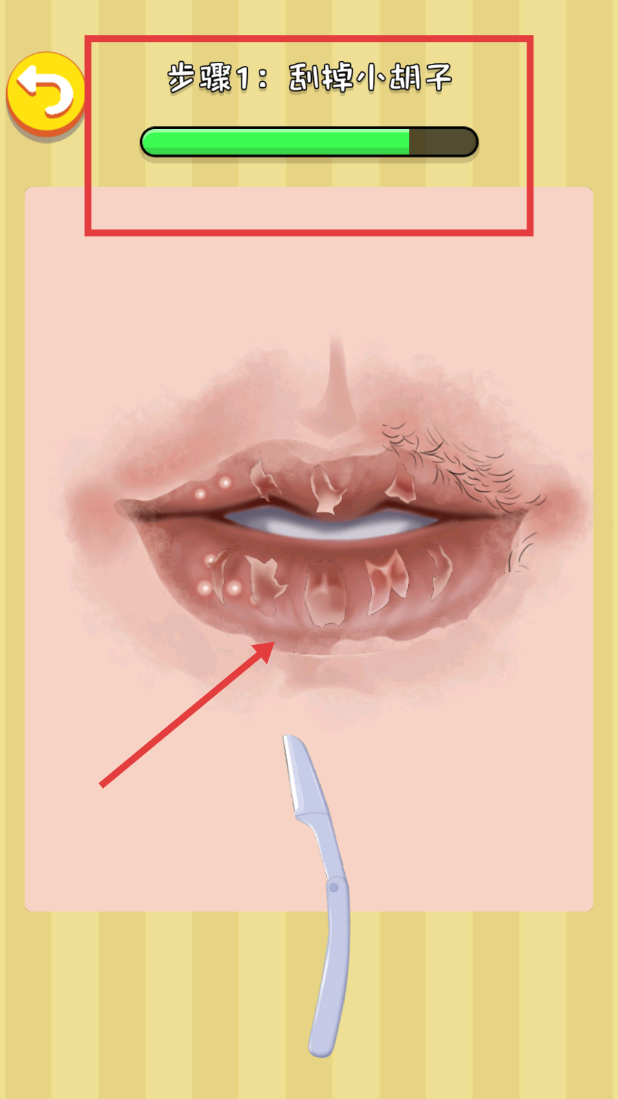 2、执行【步骤1-刮掉小胡子】,用工具清理唇部胡须,推动进度条完成该步骤。
