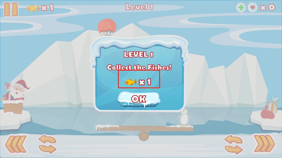 2、第一关开局弹出任务提示,要收集1条鱼,点击确认后,操控企鹅移动,利用场景里的道具调整路线,躲开障碍去拿到鱼。