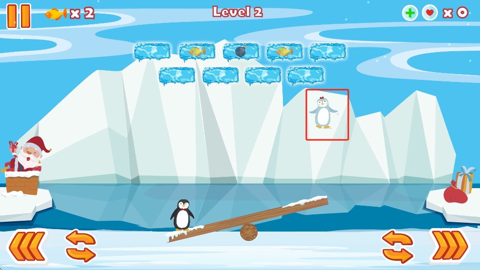3、先观察企鹅与目标位置,借助跷跷板让己方企鹅跳跃,打碎冰块获取鱼,同时避开炸弹,靠近并接应目标企鹅。