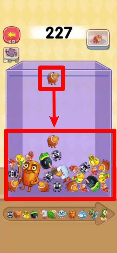 2.下落合成:各种不同造型的小怪物会从上方落下,玩家需要让它们在容器中碰撞合成,逐步完成新的角色。