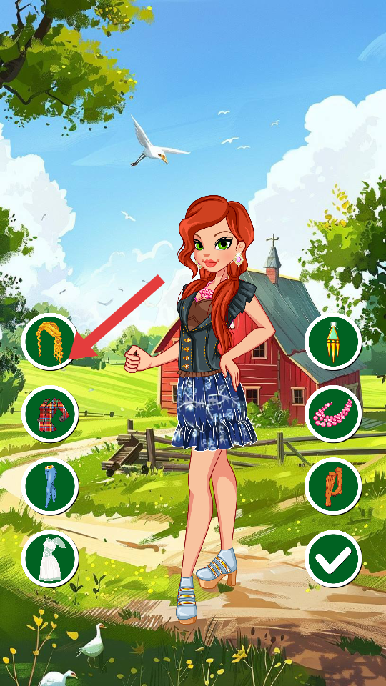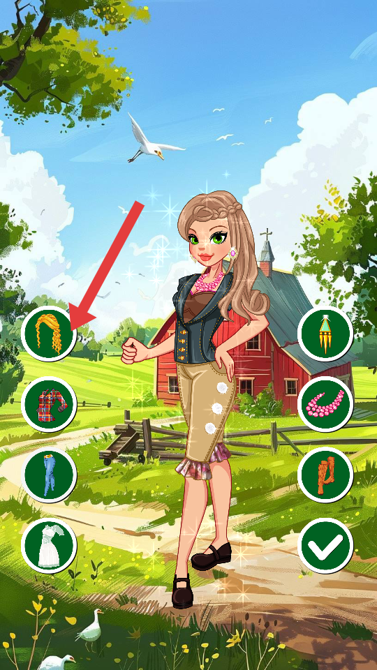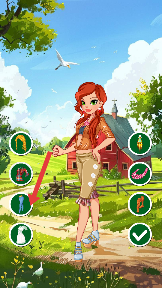 3、所有服饰搭配完毕,检查整体效果,确认无误后点击右下角绿色√,保存装扮,完成田园风角色换装挑战。