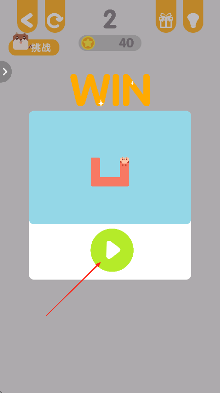 3、当动物移动完所有方块路径,成功到达终点,出现WIN界面,点击绿色按钮进入下一关。