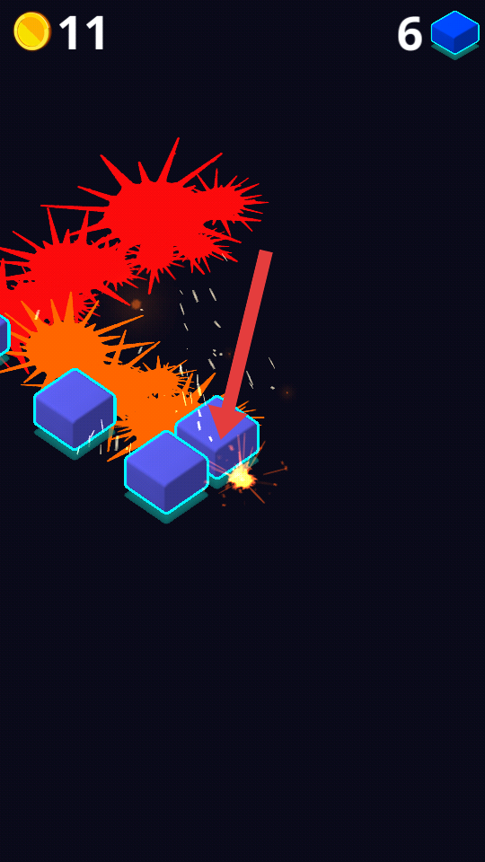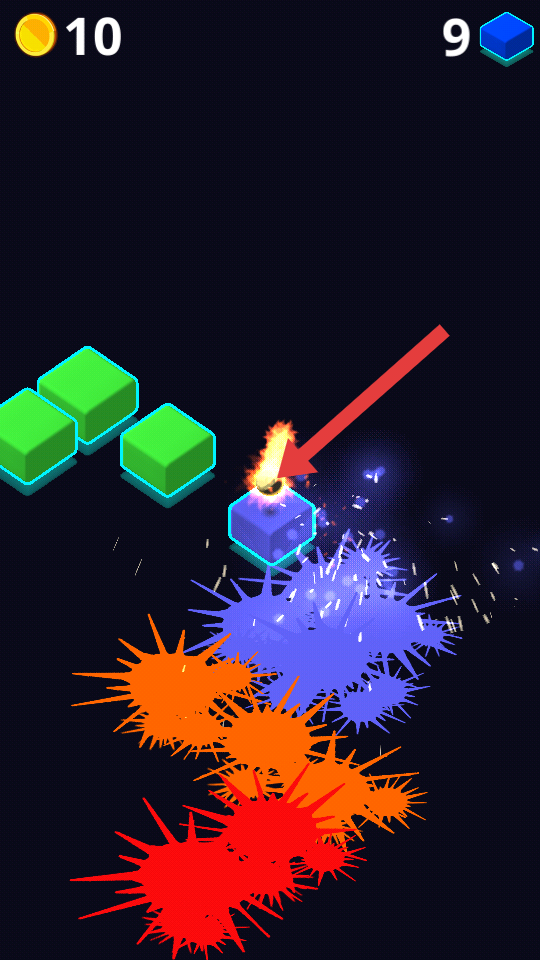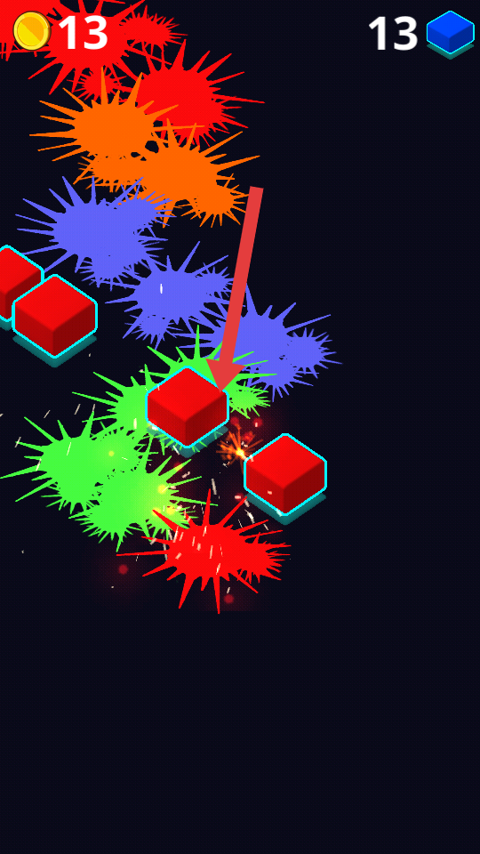 1、进入游戏,点击屏幕操控球球跳动,击碎可获金币,注意彩色方块,规划顺序,优先清理难处理的。