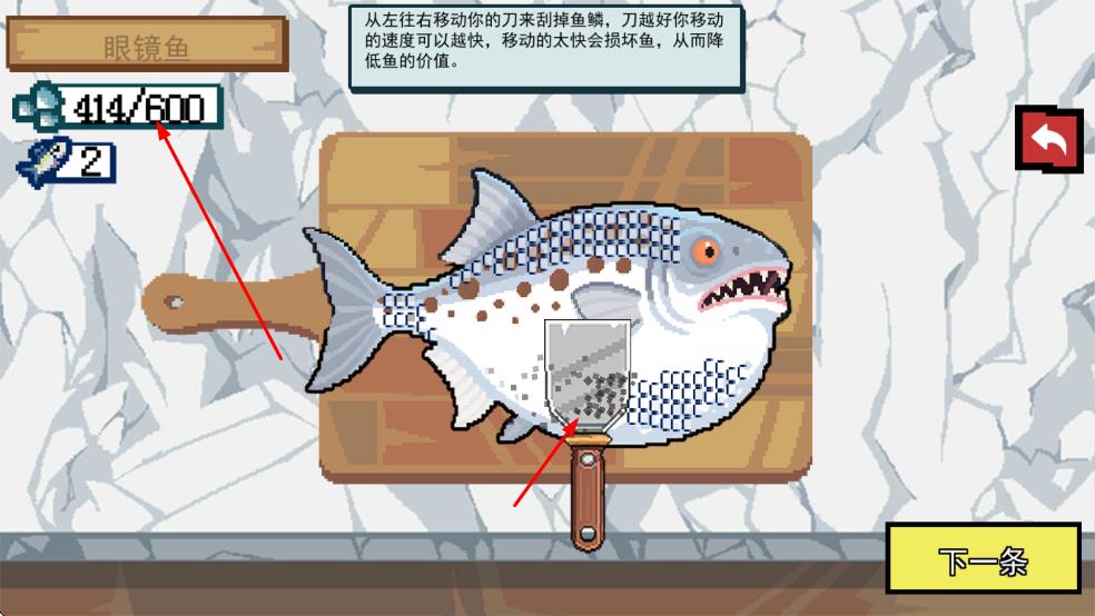 2、进入刮鳞界面,从左往右移动刀具刮除鱼鳞,控制速度避免损鱼,提升鱼的价值。