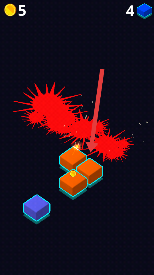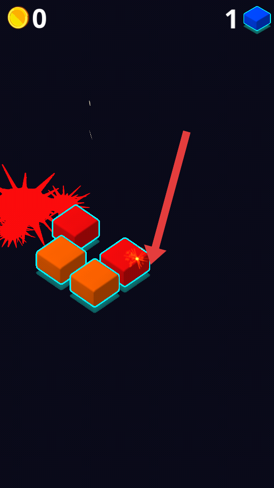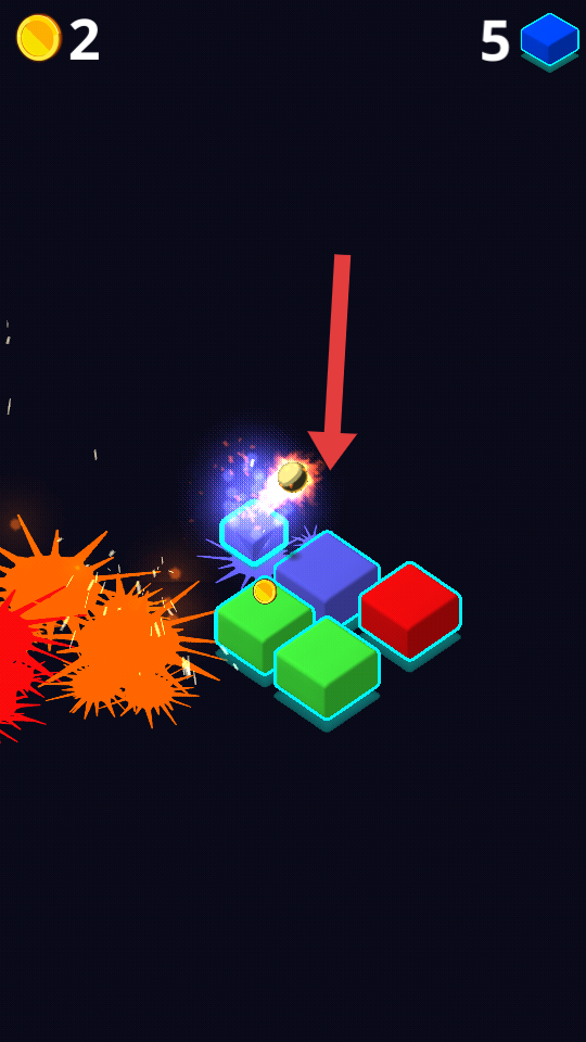 2、瞄准不同颜色方块,点击屏幕下方射击按键发射弹体,获取左上角金币,消除右上角计数目标对应的方块。