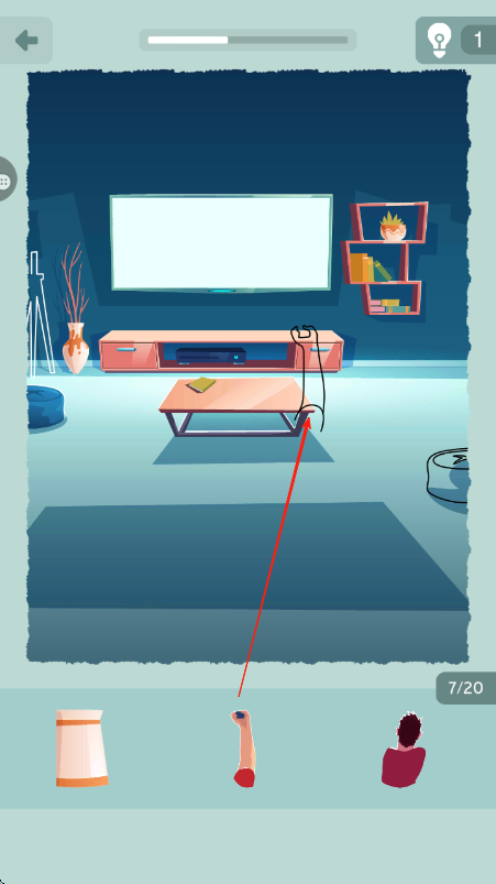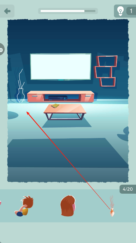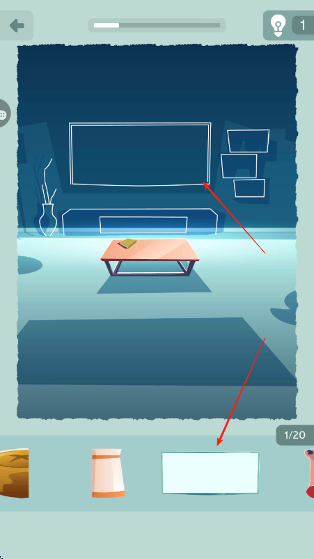 1、进入游戏关卡,查看右上角的进度提示1/20,按红箭头方向,观察上方房间轮廓图,从下方素材中选择对应图形。
