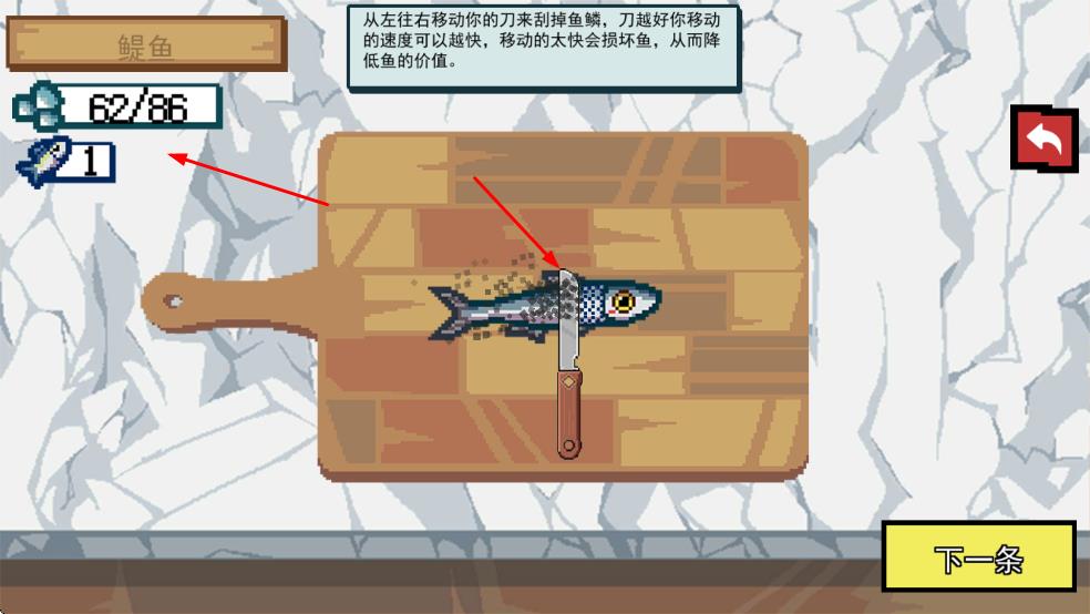 2、刮鱼鳞时,从左往右移动刀具,控制速度,过快损坏鱼,提升价值。