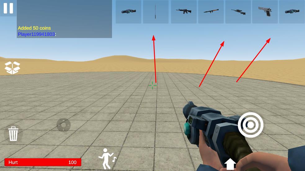 1、切换顶部武器栏选枪械,获取金币,利用武器交互场景。