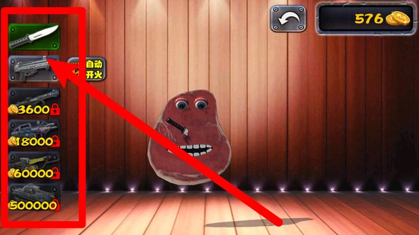 2.武器选择:左侧提供刀具与枪械等武器,玩家可自由选择不同方式对牛排进行恶搞操作,带来搞笑且刺激的体验。