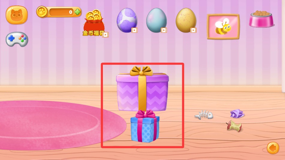 2、点击礼物盒图标选择零食或玩具等互动道具,通过投喂与玩耍提升宠物亲密度数值。