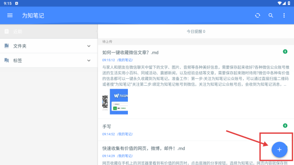 1、打开为知笔记应用,点击右侧+按钮,弹出创建笔记功能菜单。