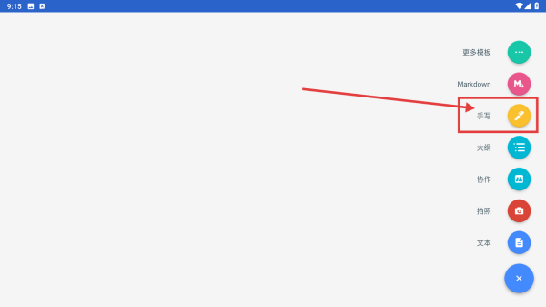 2、在功能菜单中,点击手写选项,进入手写笔记编辑页面。