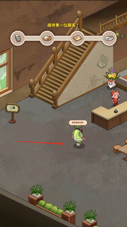 1、进入游戏,看到接待第一位顾客提示,按红箭头指引,操控角色移动到顾客身旁,开始服务。