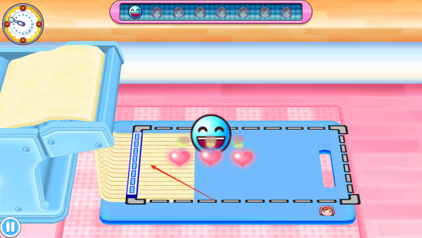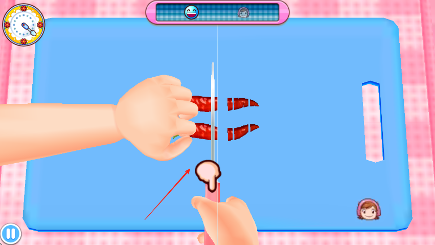 1、进入游戏关卡,按红箭头指示,用手指滑动屏幕操控刀具,像切辣椒时,注意按要求切成合适大小。