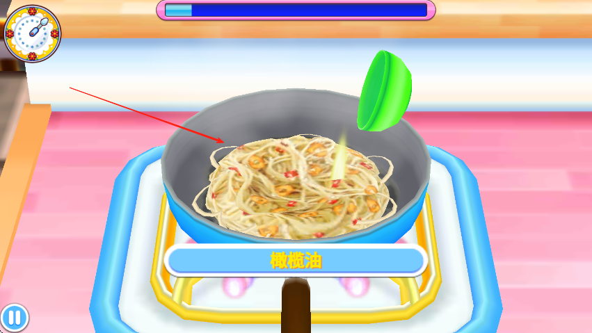 3、把面条等食材放入锅中,按红箭头方向添加橄榄油等调料,按提示完成烹饪步骤,直至做出美味料理通关。