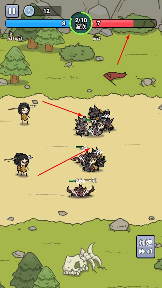 2、点击开战,背包小兵自动参战,抵御多波敌人,观察双方血量条推进战局。