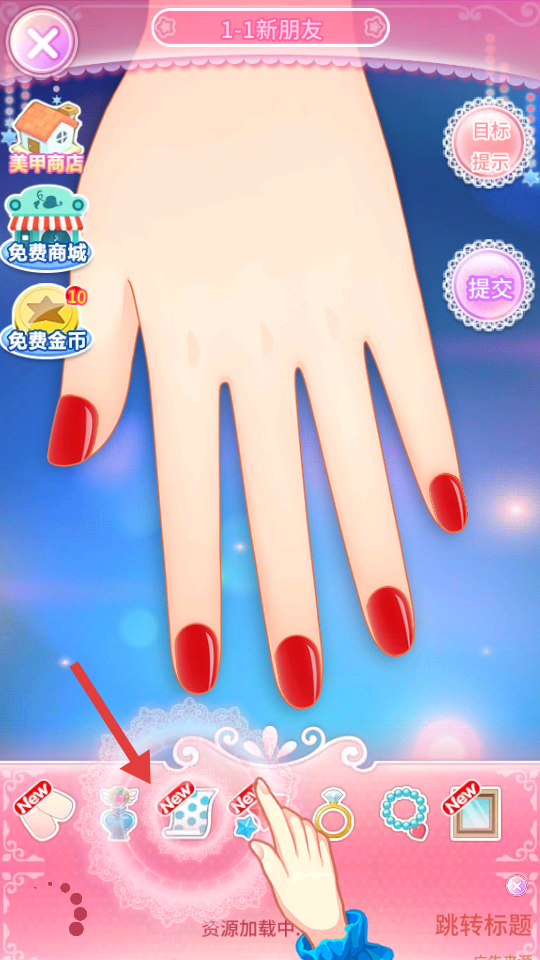 2、在装饰界面挑选甲油颜色、图案贴纸和魔法饰品,通过点击、拖拽操作将部件应用到指甲上,调整位置与大小。