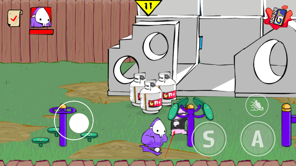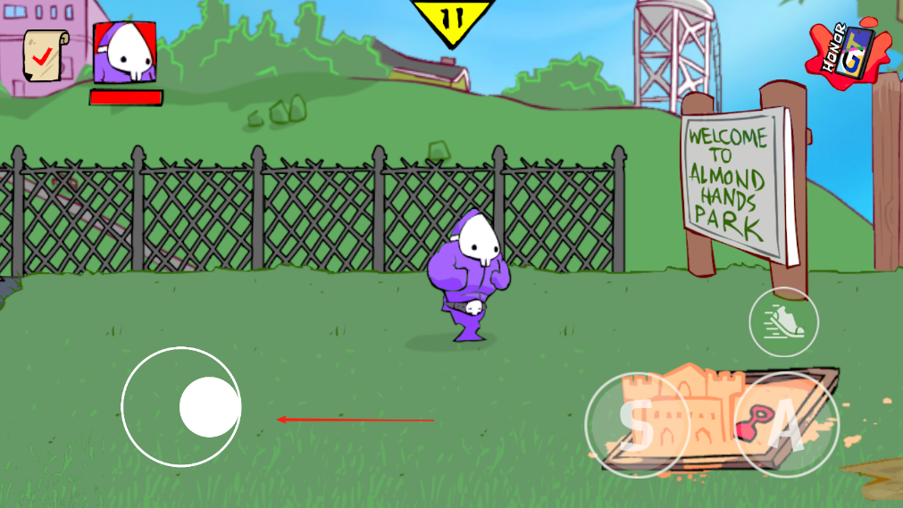 1、进入游戏,通过点击左下角虚拟摇杆控制紫色角色移动,在ALMOND HANDS PARK场景中探索。