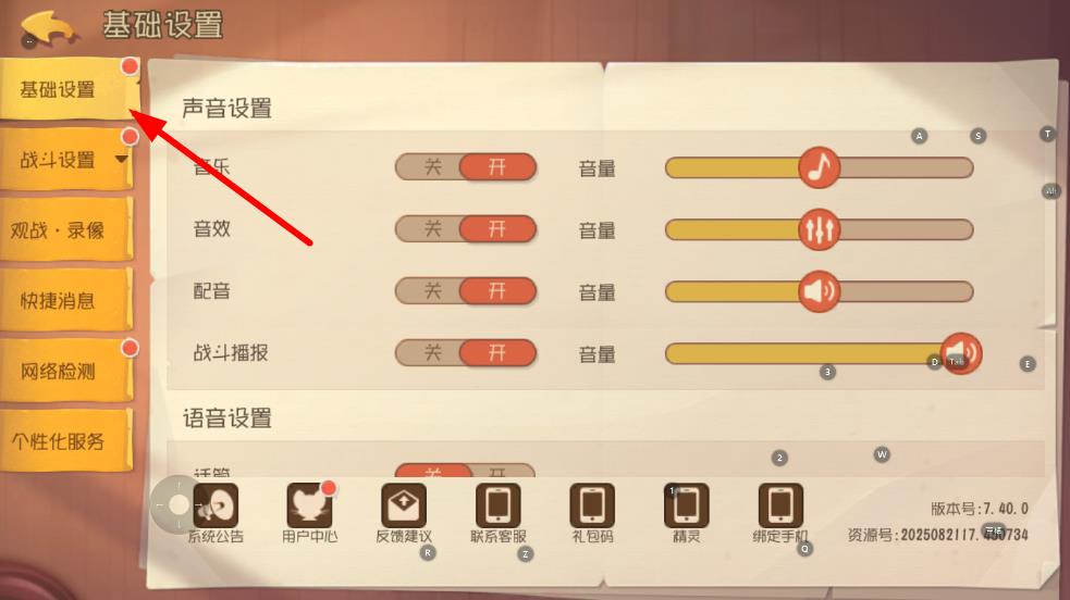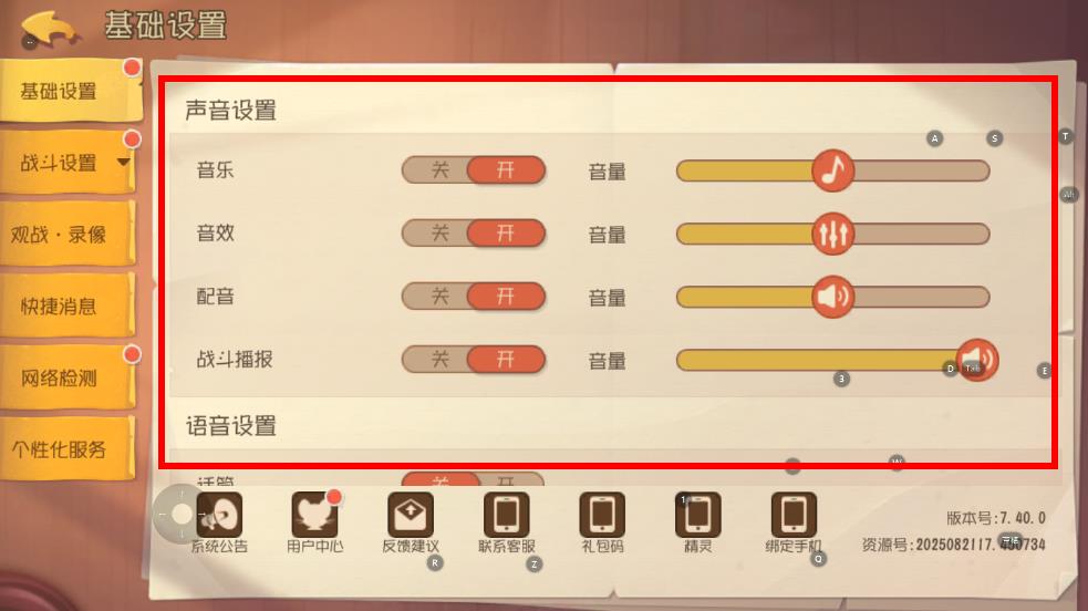 3、在基础设置页面的声音设置板块,找到音乐、音效、配音、战斗播报选项,点击对应选项的开关按钮,将其状态切换为关,即可关闭相应的游戏声音。