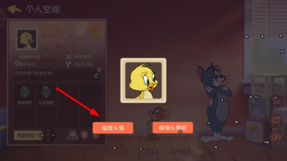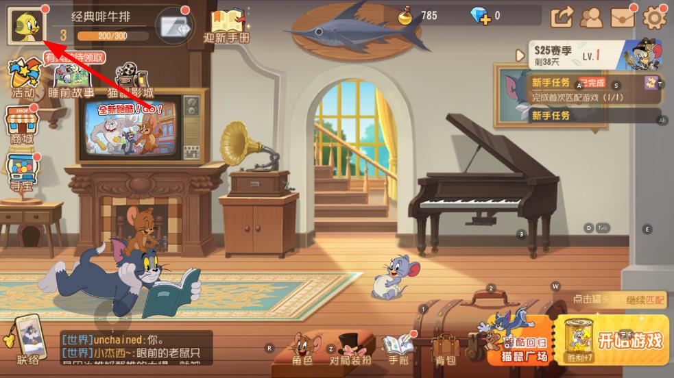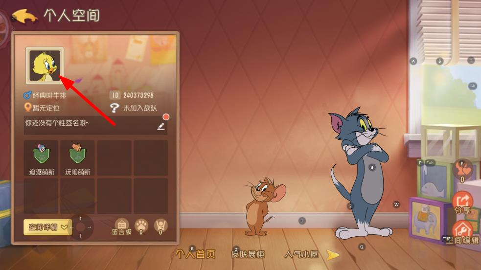 1、猫和老鼠游戏主界面点击左上角头像,通过该操作进入个人空间界面,以便进行后续头像更换操作。