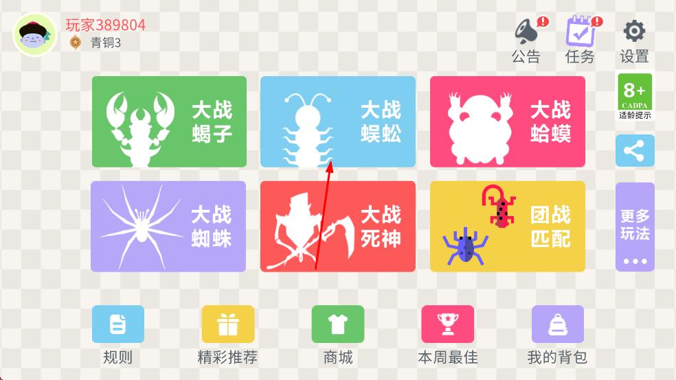 1、主界面选择模式大战蜈蚣/蝎子等、团战匹配,进入游戏。