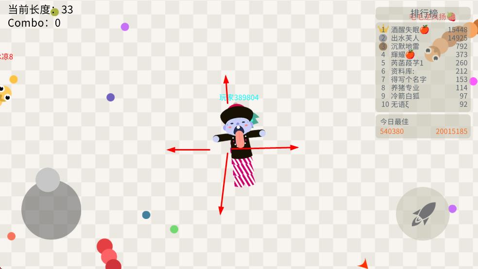 2、用虚拟摇杆操控角色移动,吞噬场景彩点,增长长度,拾取火箭道具加速。