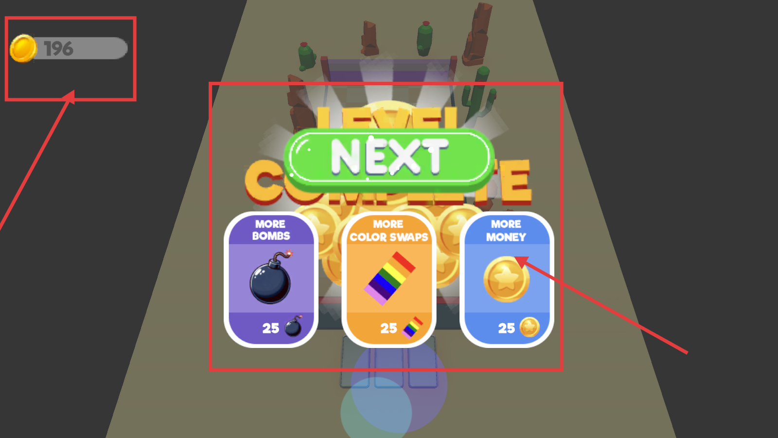 3、通关后点击【NEXT】,可按需选【MORE-MONEY】等奖励,助力后续关卡,关注左上角【196】金币收益。