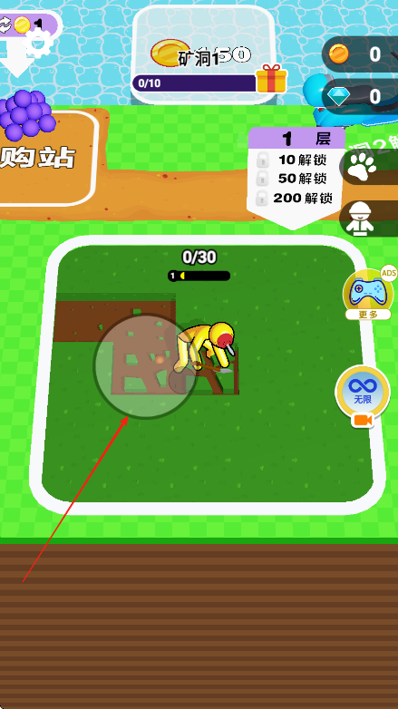 1、进入游戏,查看屏幕上方矿洞进度和金币钻石数量,通过左下角虚拟摇杆控制角色移动到挖掘点。